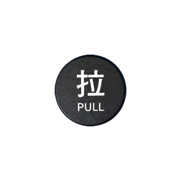 壓克力圓型標示牌採用霧黑壓克力材質,搭配白色「拉」字設計,視覺對比強烈,指示一目了然。